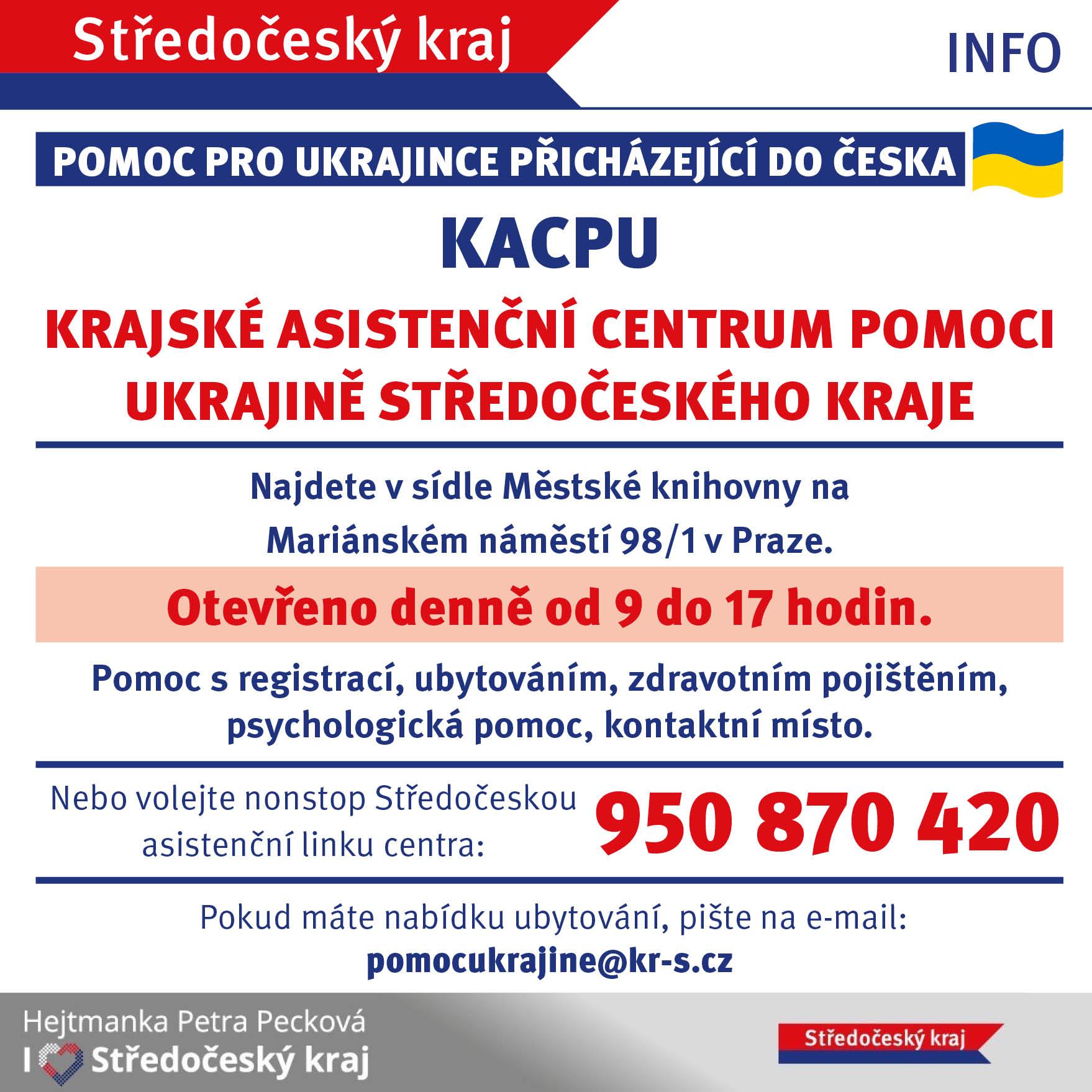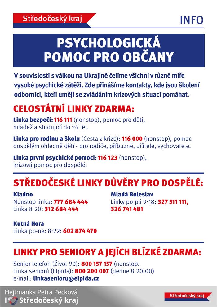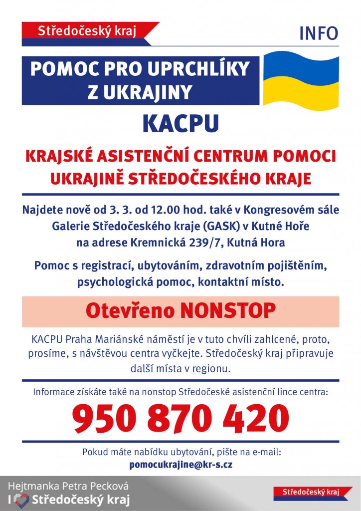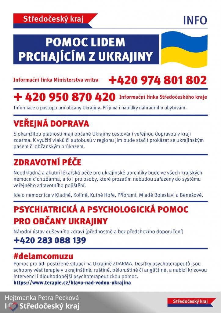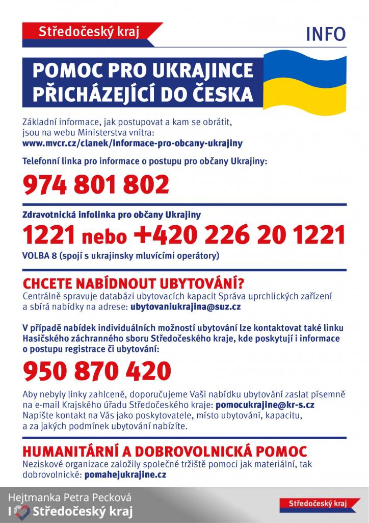 Zveřejňujeme letáky s různými kontakty pro Ukrajince přicházející do Česka, dále pak pro občany ČR, kteří mohou nabídnout nějaké ubytování a zároveň informace o možnostech pomoci materiální a finanční.