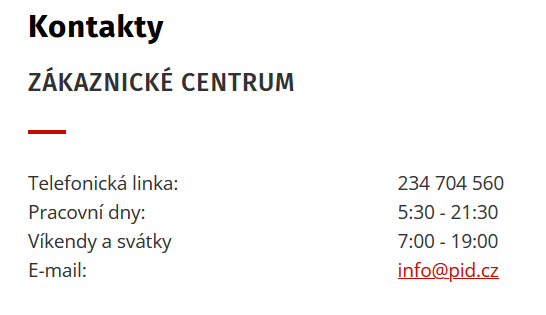 Případně lze volat dispečink - zákaznické centrum - na telefoní číslo 234 704 560, a to ve všední dny od 5:30 hodin do 21:30 hodin a o víkendu a ve svátek pak od 7:00 do 19:00 hodin, případně využít ke kontaktu email: http://info@pid.cz