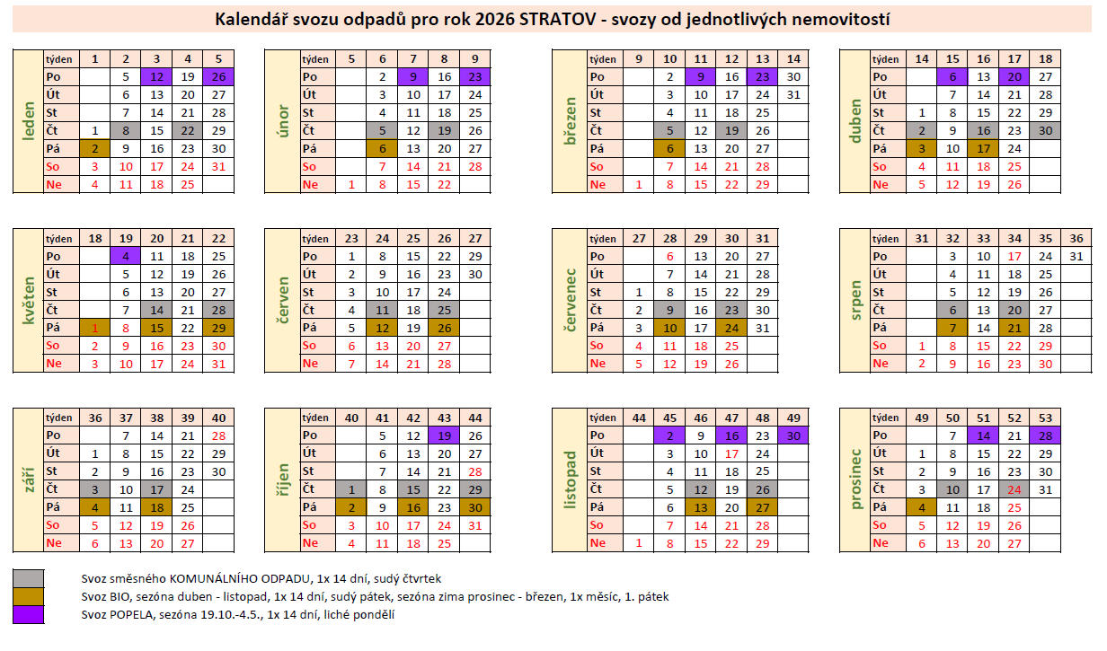 Zveřejňujeme Kalendář svozu odpadů pro rok 2026 pro Obec STRATOV - svozy od jednotlivých nemovitostí. Ke stažení -