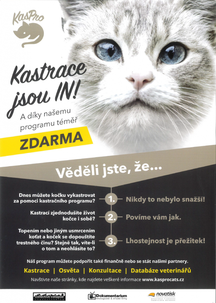 Zveřejňujeme leták, kde se dozvíte vše ohledně možnosti téměř bezplatné kastrace koček díky kastračnímu programu KasProCats - podrobnosti na tomto letáku.