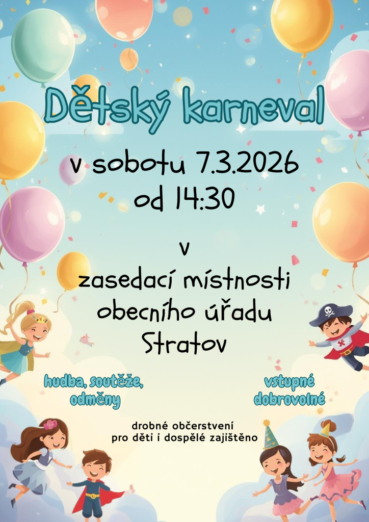 Zveme Vás a Vaše děti na DĚTSKÝ KARNEVAL v sobotu 7.3.2026 od 14,30 v zasedací místnosti obecního úřadu.