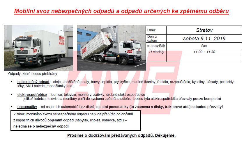 Svoz nebezpečných odpadů proběhne dne 9.11.2019 v 11,00 hodin od stodoly obecního úřadu u fotbalového hřiště.
